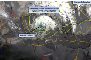 Η κακοκαιρία που επηρεάζει τη χώρα μας από χθες, σχετίζεται με δύο βαρομετρικά χαμηλά, ένα στην Ιταλία και ένα στη Βαλκανική, τα κέντρα των οποίων το απόγευμα...