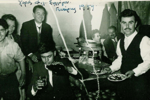 Πρωτοχρονιάτικος χορός Φιλολογικού Συλλόγου Κισάμου (1959). Από αριστερά: Γεράσιμος Σκαράκης, Φιλένια Πατεράκη, Λευτέρης Παπαδάκης, Ανδρέας Ξηρουχάκης, Γιάννης...