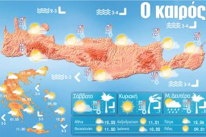 Γενικά αίθριος προβλέπεται ο καιρός αύριο Τετάρτη, 13 Απριλίου στην Κρήτη, με κατά τόπους αραιές νεφώσεις. Οι άνεμοι θα πνέουν από βόρειες διευθύνσεις 3 με 5...