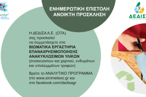 Η Διαδημοτική Επιχείρηση Διαχείρισης Στερεών Αποβλήτων [ΔΕΔΙΣΑ Α.Ε. (ΟΤΑ)] , στο πλαίσιο του Επικοινωνιακού Προγράμματος “Συμμετέχω!” στην «ΠΡΟΛΗΨΗ αλλά και...