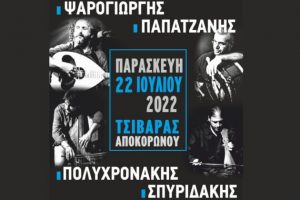 Την Παρασκευή 22 Ιουλίου 2022, θα βρεθούν στον προαύλειο χώρο του πρώην δημοτικού σχολείου στον Τσιβαρά Αποκορώνου οι Γιώργης Ξυλούρης (Ψαρογιώργης), Γιάννης...