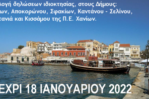 Ξεκίνησε τη Δευτέρα 18 Οκτωβρίου 2021 η συλλογή δηλώσεων ιδιοκτησίας, στους Δήμους Χανίων, Αποκορώνου, Σφακίων, Καντάνου – Σελίνου, Πλατανιά και Κισάμου της Π...
