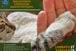 Ο Δήμος Χανίων διοργανώνει ακόμα μία δράση εθελοντικών στειρώσεων στις 17 και 18 Απριλίου 2021, σε συνεργασία με τους κτηνιάτρους Ελευθέριο Χατζηδάκη και Julia...