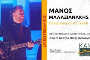 Την Παρασκευή 23/10/2020 στις 22.00, ο Δήμος Χανίων και η Κ.Ε.Π.ΠΕ.ΔΗ.Χ.-Κ.Α.Μ. διοργανώνουν την πρώτη πειραματική διαδικτυακή συναυλία. Η συναυλία με τον...