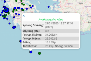 Σεισμική δόνηση μεγέθους 3,2 βαθμών της κλίμακας Ρίχτερ σημειώθηκε στις 14:27 78 χλμ νοτιοδυτικά της Γαύδου. Σύμφωνα με το Γεωδυναμικό Ινστιτούτο, το εστιακό...
