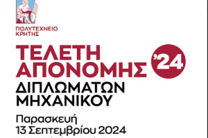 Η Τελετή Απονομής Διπλωμάτων Μηχανικού του Πολυτεχνείου Κρήτης για την ανακήρυξη της εξεταστικής του εαρινού εξαμήνου 2023-2024, θα πραγματοποιηθεί την...