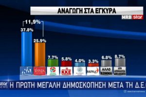 Στο 11,9% στην αναγωγή επί των έγκυρων ψηφοδελτίων, είναι το προβάδισμα που έχει η Nέα Δημοκρατία έναντι του ΣΥΡΙΖΑ, σύμφωνα με τη δημοσκόπηση που διενήργησε η...