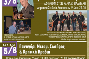 Εδώ και πάρα πολλά χρόνια στις αρχές του Αυγούστου πραγματοποιείται στις Λουσακιές η βραδιά Κρητικού Συρτού. Μια εκδήλωση που σέβεται και τιμά την παράδοση της...