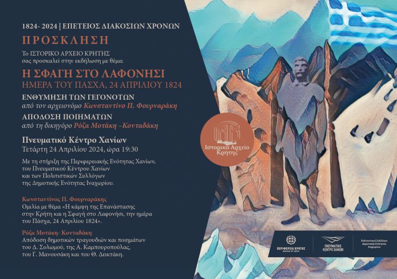 Η εκδήλωση πραγματοποιείται με την υποστήριξη της Περιφερειακής Ενότητας Χανίων, του Πνευματικού Κέντρου Χανίων και των Πολιτιστικών Συλλόγων του Ιναχωρίου, και περιλαμβάνει ομιλία του Κωνσταντίνου Π. Φουρναράκη με θέμα: «Η κάμψη της Επανάστασης στην Κρήτη και η σφαγή στο Λαφονήσι την ημέρα του Πάσχα του 1824» και απόδοση δημοτικών τραγουδιών και ποιημάτων του Δ. Σολωμού, της Α. Καμπουροπούλας, του Γ. Μανουσάκη και του Θ. Δεικτάκη από τη δικηγόρο κ. Ρόζα Μοτάκη-Κονταδάκη.