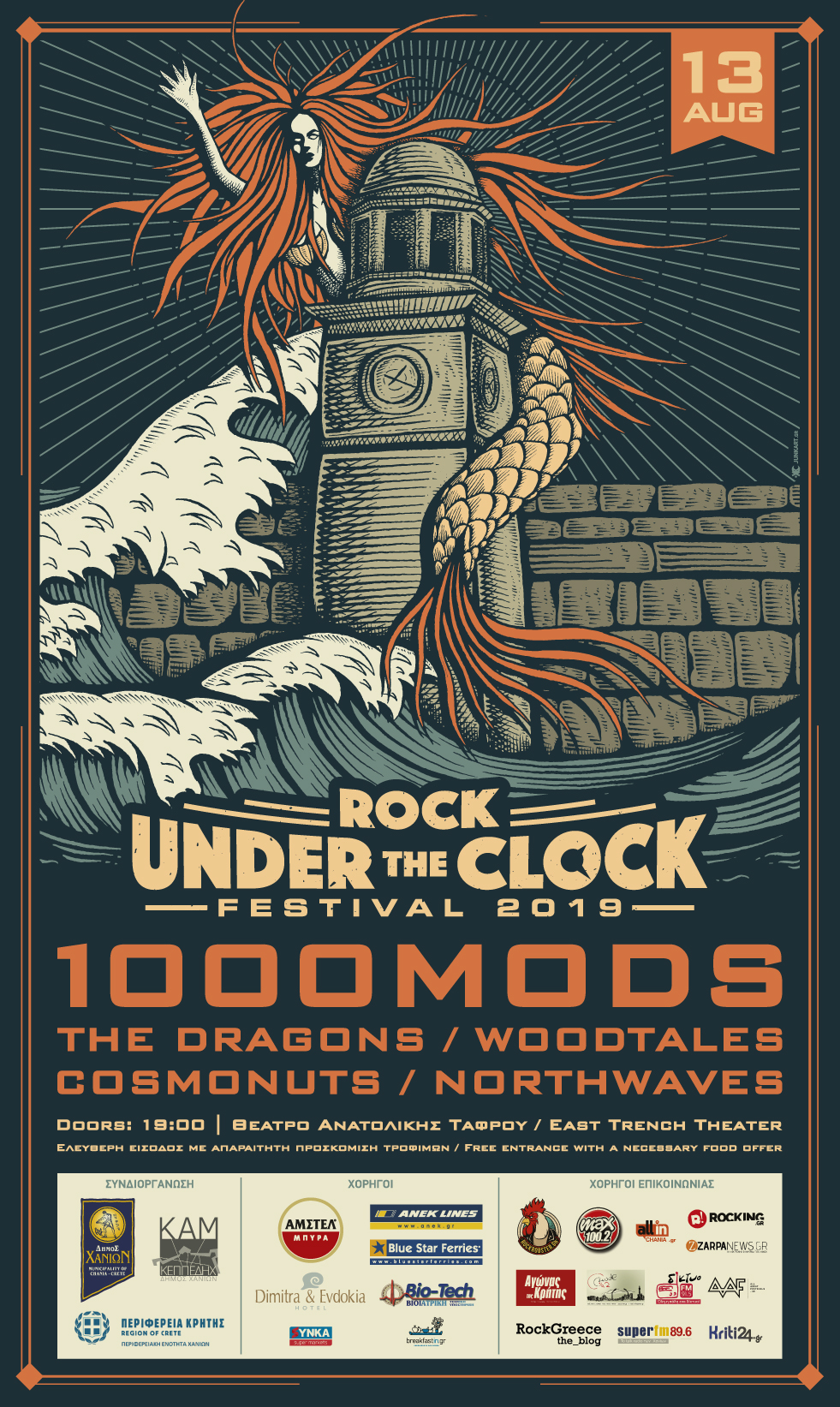 To ROCK UNDER THE CLOCK FESTIVAL 2019 διοργανώνεται φέτος, για 4η συνεχή χρονιά, με συνδιοργανωτές την Περιφέρεια Κρήτης – Περιφερειακή Ενότητα Χανίων, το Δήμο Χανίων και την ΚΕΠΠΕΔΗΧ – ΚΑΜ, την Τρίτη 13 Αυγούστου 2019, ώρα 19.00, στο Θέατρο της Ανατολικής Τάφρου.