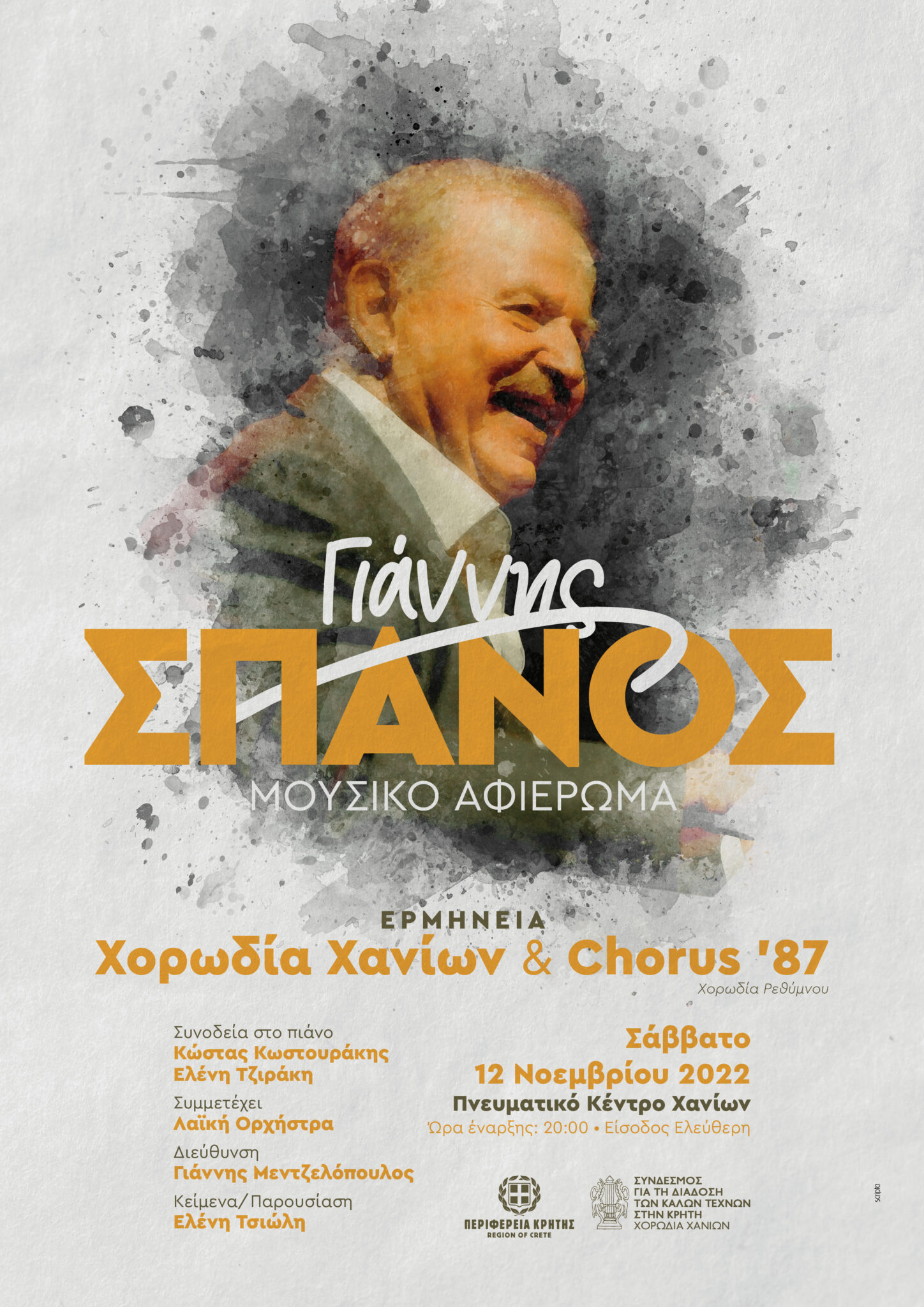Αφιέρωμα στον Συνθέτη Γιάννη Σπανό, με τη συμμετοχή της ΧΟΡΩΔΙΑΣ ΧΑΝΙΩΝ και της Ρεθεμνιώτικης χορωδίας «Chorus 87» διοργανώνεται από την Περιφέρεια Κρήτης – Περιφερειακή Ενότητα Χανίων, τον Σύνδεσμο για τη Διάδοση των Καλών Τεχνών και τη Χορωδία Χανίων, το Σάββατο 12 Νοεμβρίου 2022 και ώρα 20:00, στο Πνευματικό Κέντρο Χανίων.