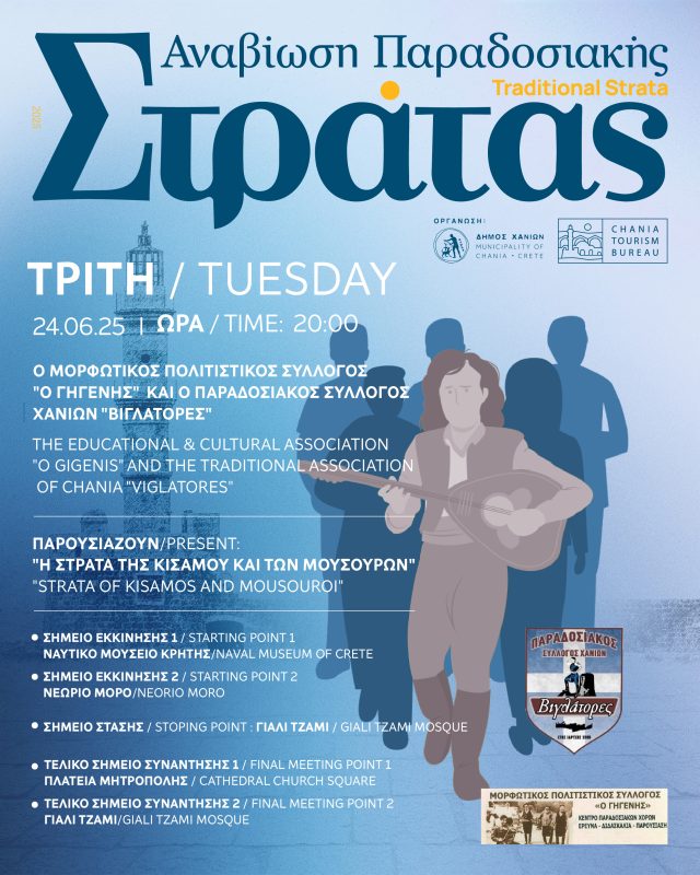 Αύριο, Τρίτη 24/6/2025 το απόγευμα, ο μορφωτικός πολιτιστικός σύλλογος «Ο Γηγενής» και ο Παραδοσιακός Σύλλογος Χανίων «Βιγλάτορες» παρουσιάζουν: «Η Στράτα της Κισάμου και των Μουσούρων».