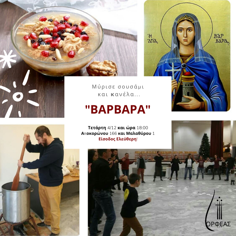 Στο πλαίσιο της υποχρέωσής μας για την ανεύρεση, συγκέντρωση, επεξεργασία, διαιώνιση και κυρίως την ανάδειξη των λαογραφικών, ιστορικών, πολιτιστικών στοιχείων της βορείου Ελλάδος ο Σύλλογός μας αναβιώνει το έθιμο της «Βαρβάρας». Συγκεκριμένα την ημέρα της εορτής της Αγίας Βαρβάρας Τετάρτη 04-12-2018 και ώρα 18:00 στην αίθουσα εκδηλώσεων του Παραρτήματος Προστασίας Παιδιών και Νέων Χανίων (Αποκορώνου 166 & Μαλαθύρου.