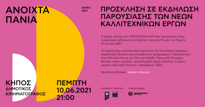 Ο Δήμος Χανίων και η Κ.Ε.Π.ΠΕ.ΔΗ.Χ.-Κ.Α.Μ. σας προσκαλούν στην παρουσίαση της δράσης «Ανοιχτά Πανιά» την Πέμπτη 10 Ιουνίου 2021 στις 21:00, στον Δημοτικό Κινηματογράφο Κήπο.