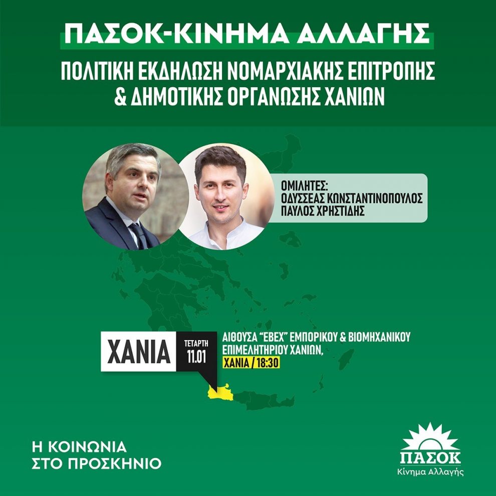 Χανιά: Ανοιχτή πολιτική εκδήλωση του ΠΑΣΟΚ – ΚΙΝΑΛ με ομιλητές Κωνσταντινόπουλο και Χρηστίδη