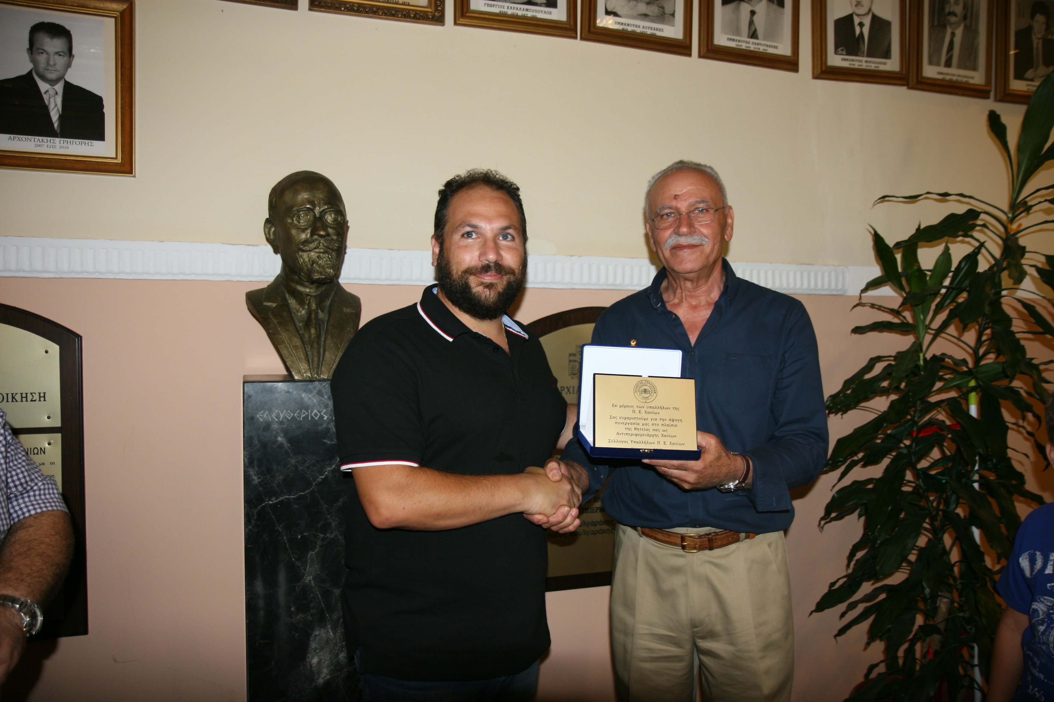 Με την προσφορά αναμνηστικού δώρου ο Πρόεδρο του Συλλόγου Εργαζομένων της Π.Ε. Χανίων, απεύθυνε εκ μέρους των εργαζομένων και των στελεχών της Π.Ε. Χανίων, τις ευχαριστίες τους προς τον κ. Απόστολο Βουλγαράκη για την πολύ καλή συνεργασία και κυρίως τον διάλογο που υπήρχε μεταξύ τους όλα αυτά τα χρόνια.
