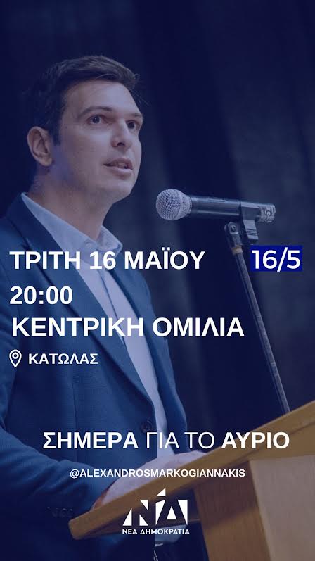 Αύριο Τρίτη Mαϊου και ώρα 8 μ.μ. θα πραγματοποιηθεί η κεντρική προεκλογική ομιλία του Υποψήφιου Βουλευτή με τη Νέα Δημοκρατία Αλέξανδρου Μαρκογιαννάκη, στο πεζόδρομο του Κάτωλα στα Χανιά.