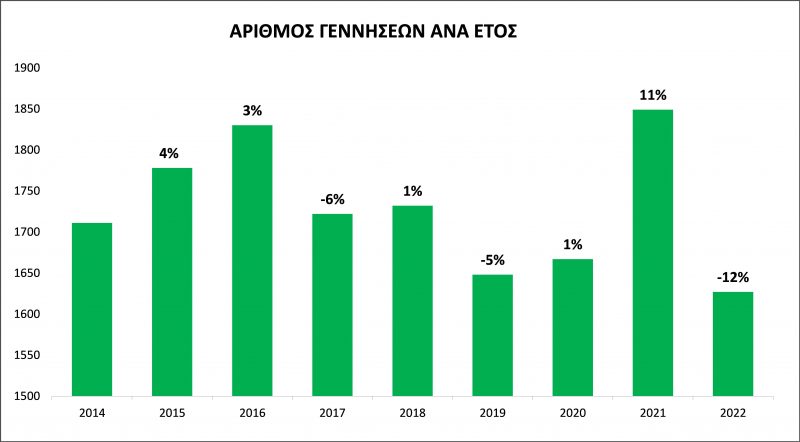 Όπως διακρίνεται στα στοιχεία του Ληξιαρχείου του Δήμου Χανίων, κατά την χρονιά που συμπληρώθηκε, καταγράφηκαν συνολικά 1.627 γεννήσεις, μειωμένες κατά 12% σε σχέση με το 2021, οπότε και είχαν δηλωθεί 1849. Αντίθετα, αντίστοιχο ποσοστό (12%) αλλά αυξημένο σε σχέση με πέρυσι, καταγράφεται στους θανάτους, 935 το 2022, έναντι 833 το 2021, καταγράφοντας τη μεγαλύτερη αύξηση θνησιμότητας της επταετίας.
