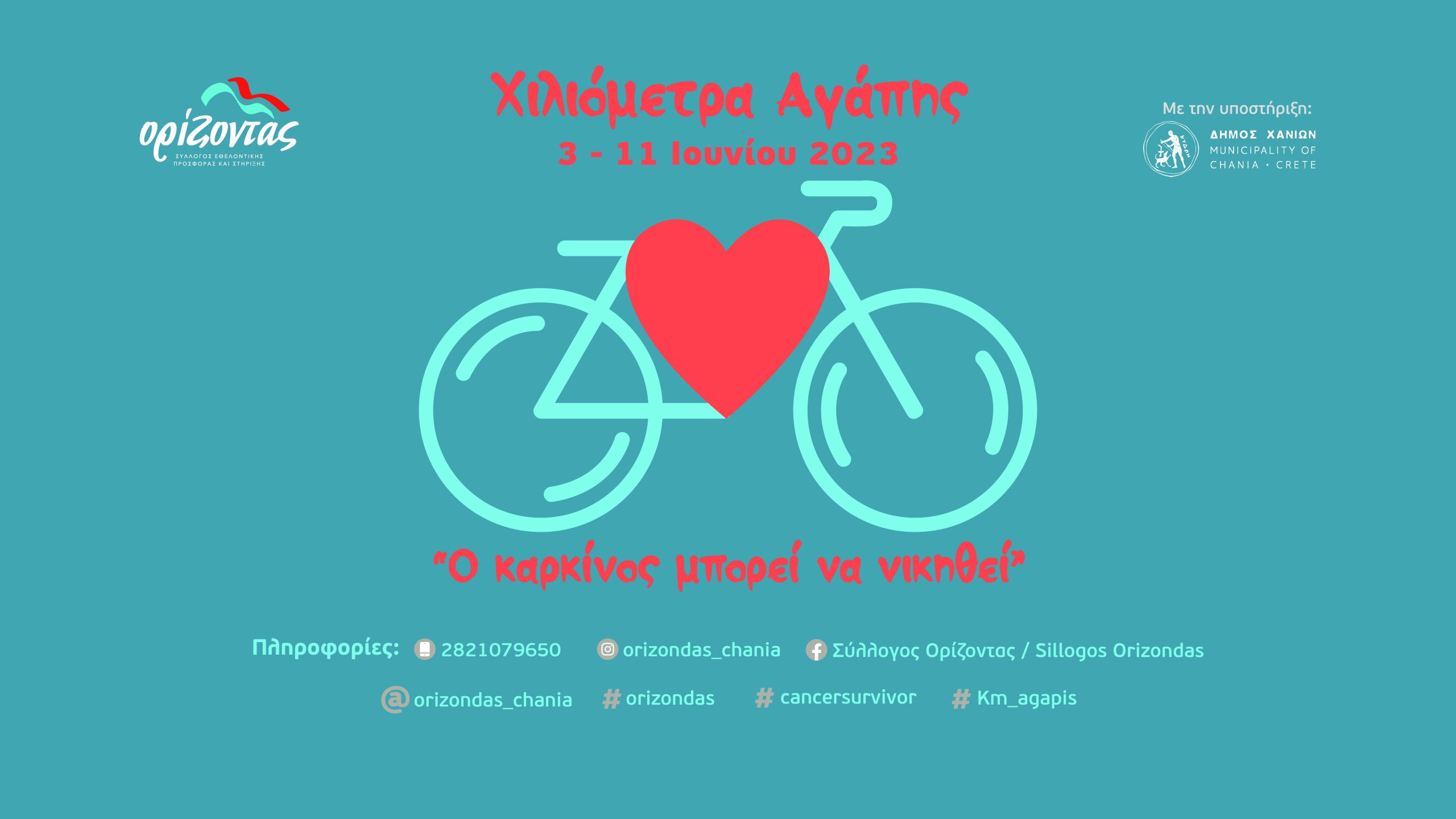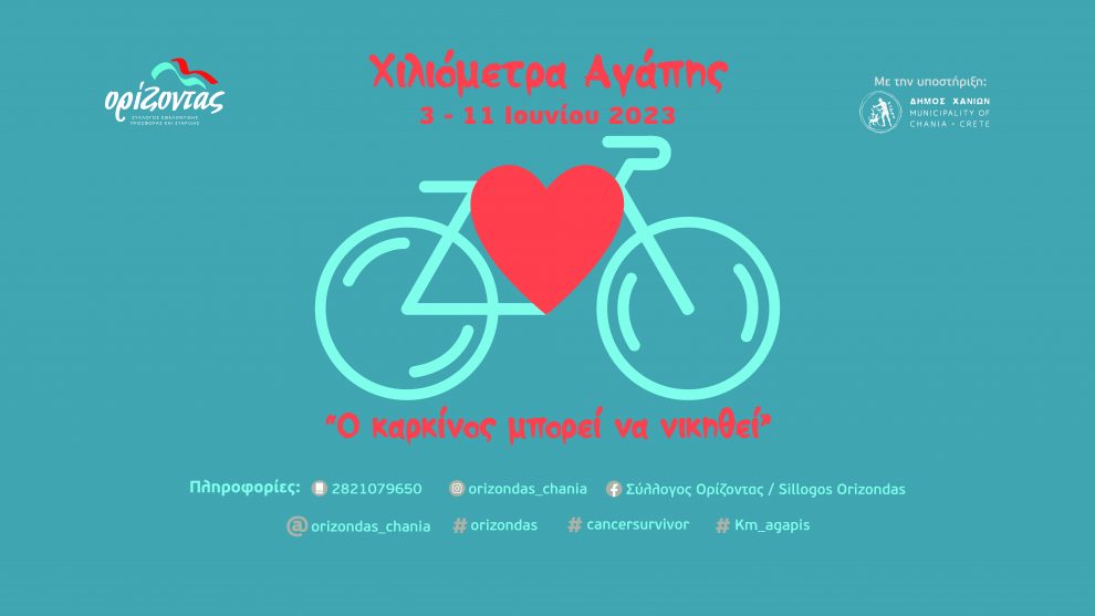 Ο Σύλλογος “Ορίζοντας” με αφορμή την Παγκόσμια Ημέρα Ποδηλάτου (3 Ιουνίου) και την Παγκόσμια Ημέρα Επιζώντων του Καρκίνου (1η Κυριακή του Ιουνίου) διοργανώνει και φέτος συμβολικό Ποδηλατικό Αγώνα σε virtual μορφή, για μικρούς και μεγάλους! Θα γιορτάσουμε όλοι μαζί, συγκεντρώνοντας όσα περισσότερα χιλιόμετρα αγάπης μπορούμε με τα ποδήλατά μας, διαδίδοντας το μήνυμα: “Ο καρκίνος μπορεί να νικηθεί!” και δίνοντας δύναμη σε όσους νοσούν και δίνουν το δικό τους καθημερινό αγώνα.
