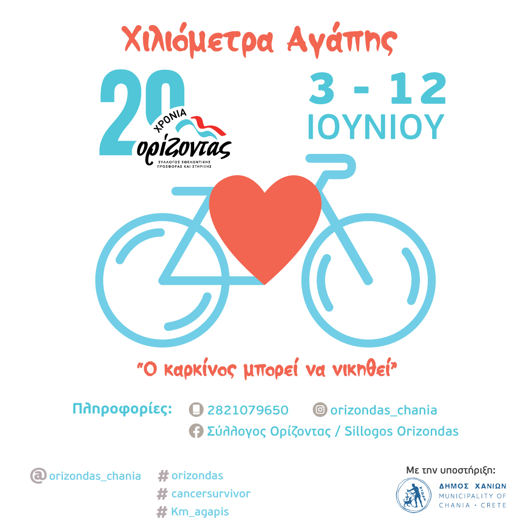 Ο Σύλλογος “Ορίζοντας” με αφορμή την Παγκόσμια Ημέρα Ποδηλάτου (3 Ιουνίου) και την Παγκόσμια Ημέρα Επιζώντων του Καρκίνου (1η Κυριακή του Ιουνίου) διοργανώνει και φέτος συμβολικό Ποδηλατικό Αγώνα σε virtual μορφή, για μικρούς και μεγάλους! Θα γιορτάσουμε όλοι μαζί, συγκεντρώνοντας όσα περισσότερα χιλιόμετρα αγάπης μπορούμε με τα ποδήλατά μας, διαδίδοντας το μήνυμα: “Ο καρκίνος μπορεί να νικηθεί!” και δίνοντας δύναμη σε όσους νοσούν και δίνουν το δικό τους καθημερινό αγώνα.