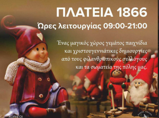 Η χριστουγεννιάτικη αγορά αλληλεγγύης θα λειτουργήσει στην πλατεία 1866 από τη Δευτέρα 16 έως και τις 31/12. Ένας μαγικός χώρος γεμάτος παιχνίδια και χριστουγεννιάτικες δημιουργίες από τους φιλανθρωπικούς Συλλόγους και τα σωματεία της πόλης μας. Στην αγορά θα συμμετέχουν οι Σύλλογοι: «ΚΗΦΑΠ ΜΕΓΑΛΟΧΑΡΗ», «Η ΠΡΟΣΤΑΣΙΑ ΤΩΝ ΖΩΩΝ», «ΚΕΘΕΑ ΑΡΙΑΔΝΗ», «ΣΩΜΑ ΕΛΛΗΝΙΚΟΥ ΟΔΗΓΙΣΜΟΥ Τ.Τ. ΧΑΝΙΩΝ», «ΕΛΕΠΑΠ», «ΚΕΝΤΡΟ ΗΜΕΡΑΣ ΝΟΣΟΥ ALZHEIMER ΧΑΝΙΩΝ» «ΚΗΦΑΑΜΕΑ», «ΤΟ ΧΑΜΟΓΕΛΟ ΤΟΥ ΠΑΙΔΙΟΥ», «ΣΥΝΑΝΘΡΩΠΟΣ», «ΕΣΠΕΡΙΝΟ ΕΠΑ.Λ. ΧΑΝΙΩΝ» ΚΑΙ «ΣΥΛΛΟΓΙΚΗ ΚΟΥΖΙΝΑ ΧΑΝΙΩΝ».