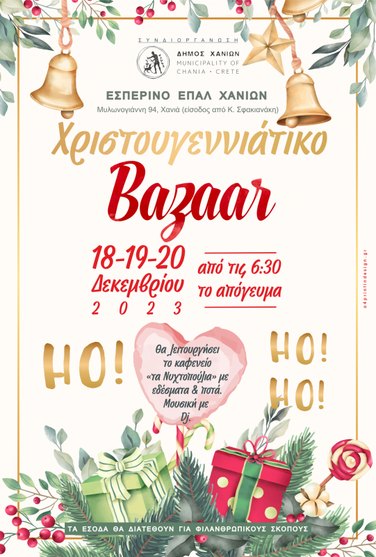 Σε συνδιοργάνωση με τον Δήμο Χανίων, το Εσπερινό ΕΠΑΛ Χανίων, πιστό στο χριστουγεννιάτικο ραντεβού του, διοργανώνει και φέτος από τις 18 έως τις 20 Δεκεμβρίου, από τις 18.30, bazaar για φιλανθρωπικό σκοπό. Το bazaar θα πραγματοποιηθεί στον χώρο του ΕΠΑΛ (Μυλωνογιάννη 94, είσοδος από Κ. Σφακιανάκη).