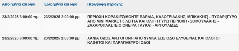 Προγραμματισμένες διακοπές ρεύματος στο Νομό Χανίων θα πραγματοποιήσει ο ΔΕΔΗΕ την Κυριακή 23 Φεβρουαρίου εξαιτίας έργων συντήρησης και επέκτασης του δικτύου του.
