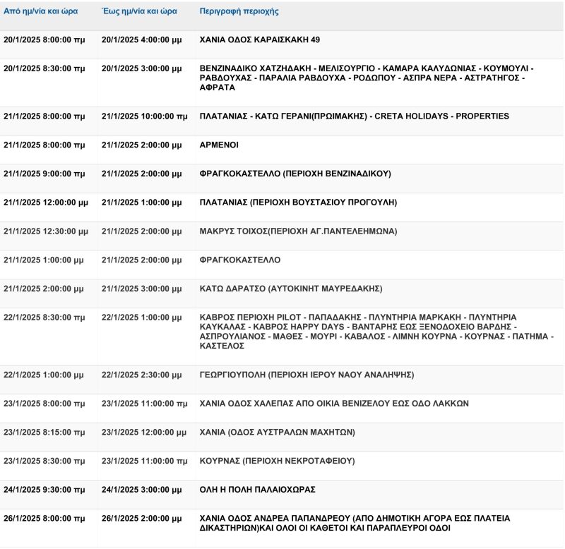 Προγραμματισμένες διακοπές ρεύματος στα Χανιά θα πραγματοποιήσει ο ΔΕΔΗΕ εξαιτίας έργων συντήρησης και επέκτασης του δικτύου του.