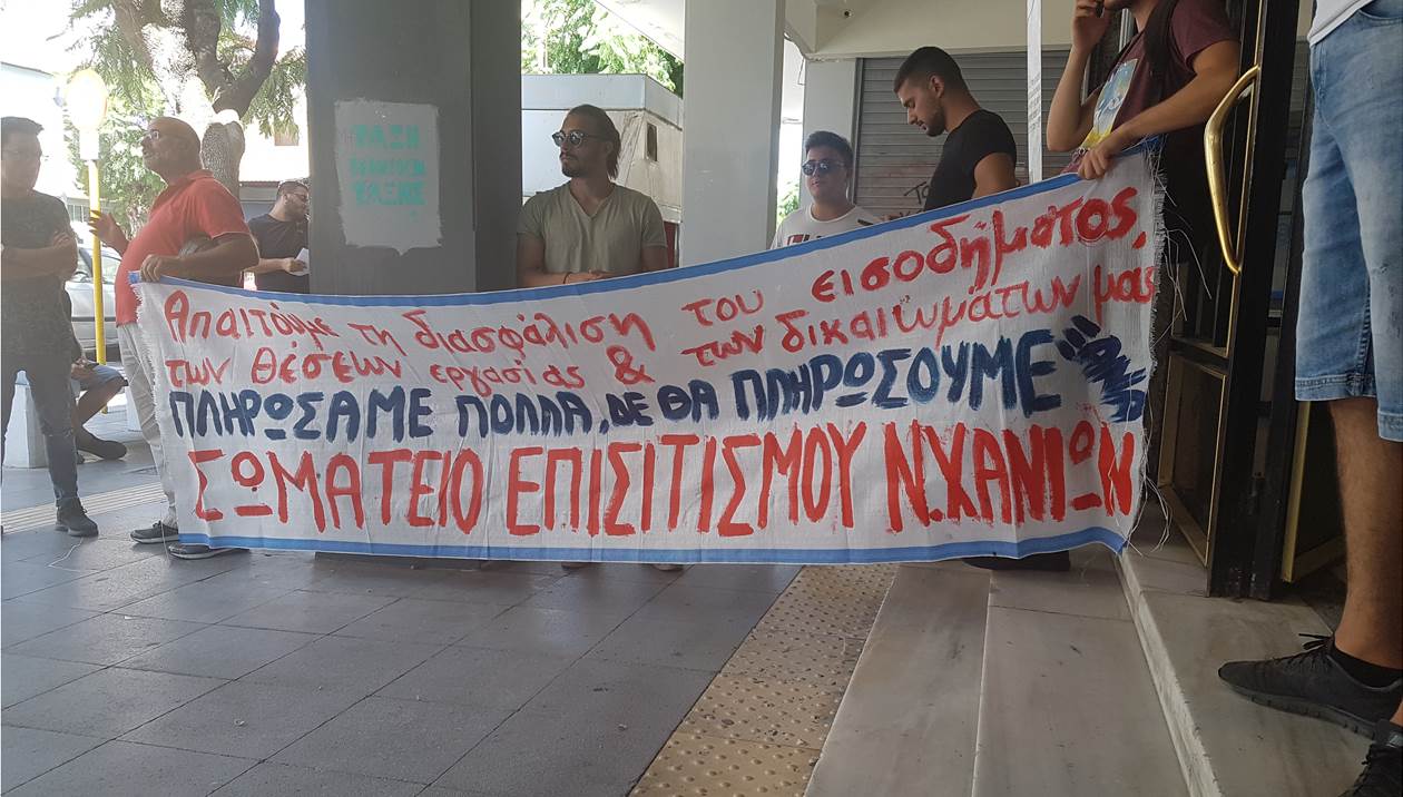 Τα σωματεία Επισιτισμού και Ιδιωτικών Υπαλλήλων πραγματοποίησαν την Τετάρτη παράσταση διαμαρτυρίας στο Δημαρχείο Χανίων ,την ώρα του Δημοτικού Συμβουλίου.