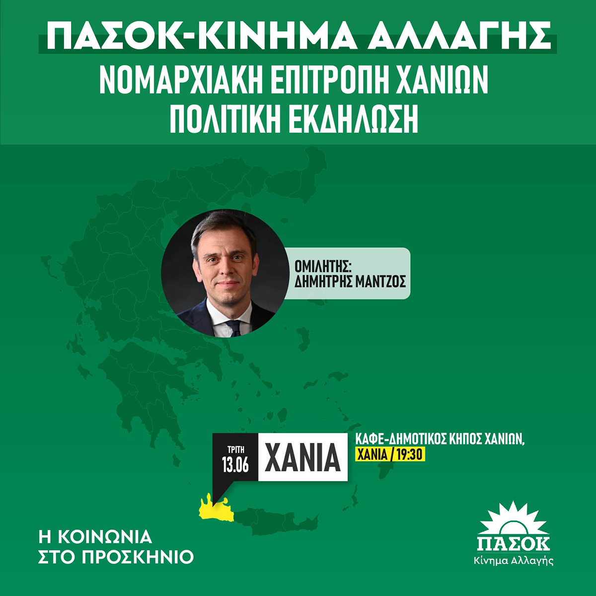 Η Ν.Ε. ΠΑΣΟΚ – Κίνημα Αλλαγής, σας ενημερώνει ότι ο Βουλευτής Επικρατείας και Εκπρόσωπος Τύπου κ. Δημήτρης Μάντζος θα βρίσκεται στα Χανιά την Τρίτη 13/6 και Τετάρτη 14/6.