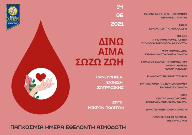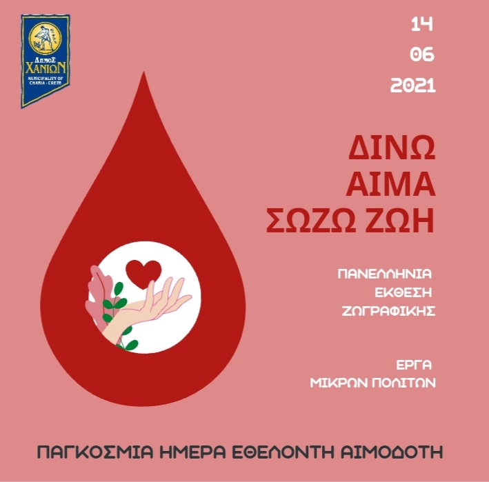 Πανελλήνια έκθεση ζωγραφικής για παιδιά, με τίτλο «Δίνω αίμα – Σώζω ζωή», διοργανώνει ο Δήμος Χανίων, με αφορμή τον εορτασμό της Παγκόσμιας Ημέρας Εθελοντή Αιμοδότη, που έχει καθιερωθεί να εορτάζεται στις 14 Ιουνίου διεθνώς, τιμώντας τον ανώνυμο εθελοντή αιμοδότη για την ανιδιοτελή προσφορά του.