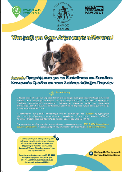 Η δράση για τη δωρεάν στείρωση και ηλεκτρονική σήμανση ζώων συντροφιάς πραγματοποιείται από τον Δήμο Χανίων σε συνεργασία με τον οργανισμό Zero Stray Pawject και την πρωτοβουλία Tieraerztepool/Arche Noah Crete.