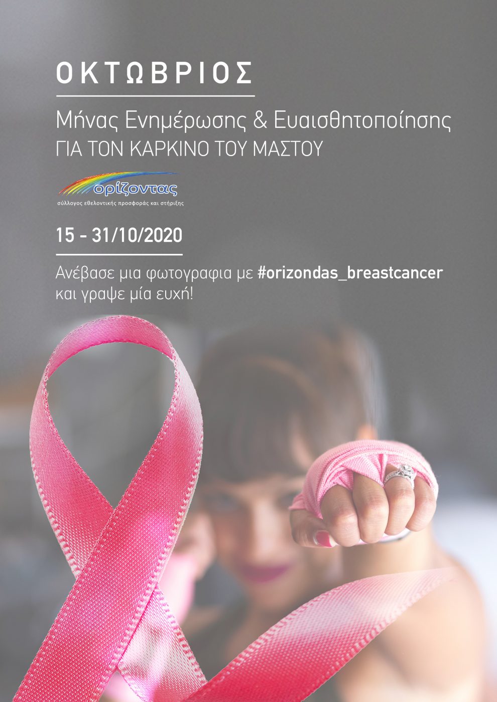 Ο Σύλλογος «Ορίζοντας» σε μία προσπάθεια ενημέρωσης και ευαισθητοποίησης του κόσμου για τον καρκίνο του μαστού, προσκαλεί μικρούς και μεγάλους να τραβήξουν συμβολικές φωτογραφίες, τις οποίες θα δημοσιεύσουν στα προσωπικά τους προφίλ στο facebookκαι στο instagram, συνοδευόμενες με #orizondas_breastcancer και μία ευχή για όλες τις γυναίκες που νόσησαν και κέρδισαν τη μάχη ή νοσούν και μάχονται για τη ζωή τους!
