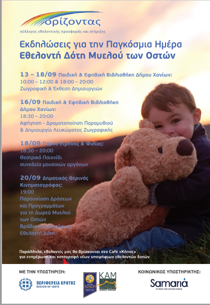 Με αφορμή την Παγκόσμια Ημέρα Εθελοντή Δότη Μυελού των Οστών και γιορτάζοντας την επίτευξη του αρχικού μας στόχου, την καταγραφή 10.000 υποψήφιων εθελοντών δοτών, εκτός από μία καμπάνια ενημέρωσης και ευαισθητοποίησης του κοινού μέσω των ΜΜΕ και των social media, διοργανώνουμε μία σειρά εκδηλώσεων, οι οποίες θα πραγματοποιηθούν κατά το διάστημα 13 – 20 Σεπτεμβρίου 2021 στην πόλη των Χανίων.