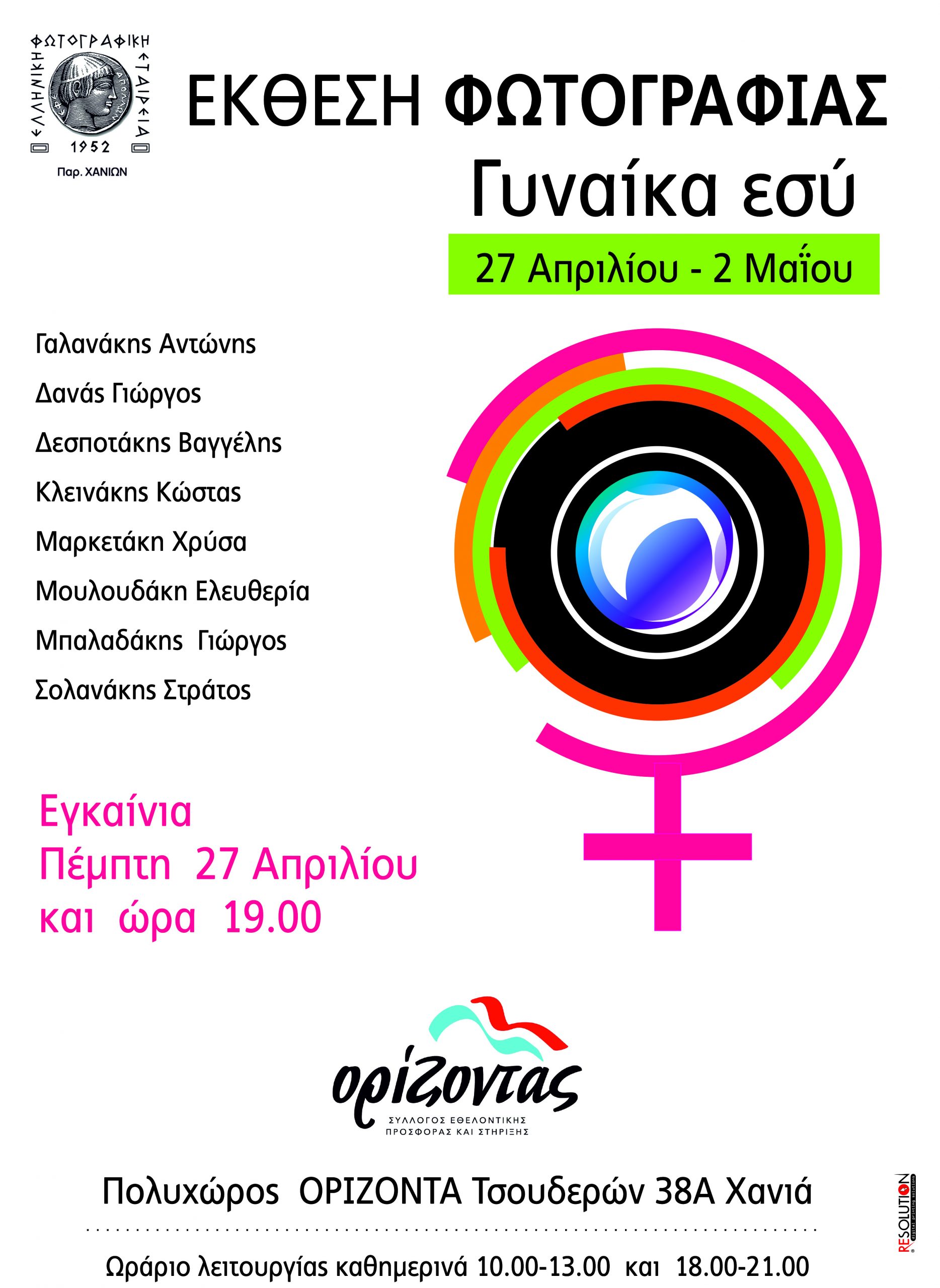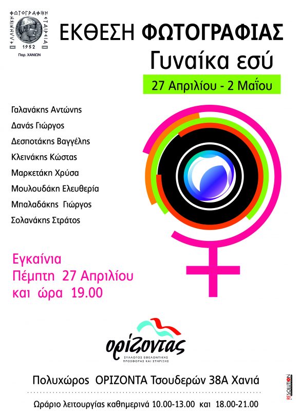 Η Ελληνική Φωτογραφική Εταιρεία (ΕΦΕ) παραρτήματος Χανίων παρουσιάζει την έκθεση φωτογραφίας των μελών «Γυναίκα εσύ» στον Πολυχώρο Δράσεων του Συλλόγου ΟΡΙΖΟΝΤΑ, στην οδό Τσουδερών 38Α.