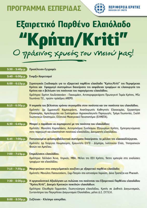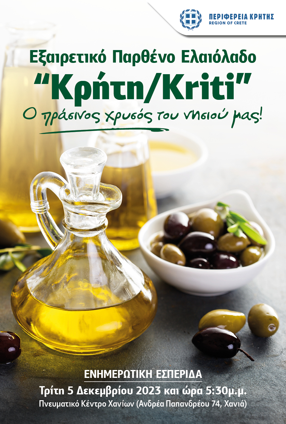 Η Περιφέρεια Κρήτης διοργανώνει στο πλαίσιο των εορτασμών της Παγκόσμιας Ημέρας Ελιάς ενημερωτική εσπερίδα αφιερωμένη στο εξαιρετικό παρθένο ελαιόλαδο «Κρήτη/Kriti» με θέμα «Εξαιρετικό Παρθένο Ελαιόλαδο «Κρήτη/Kriti», ο πράσινος χρυσός του νησιού μας», την Τρίτη 5 Δεκεμβρίου 2023 και ώρα 17:30, στο Πνευματικό Κέντρο Χανίων (Ανδρέα Παπανδρέου 74, Χανιά).