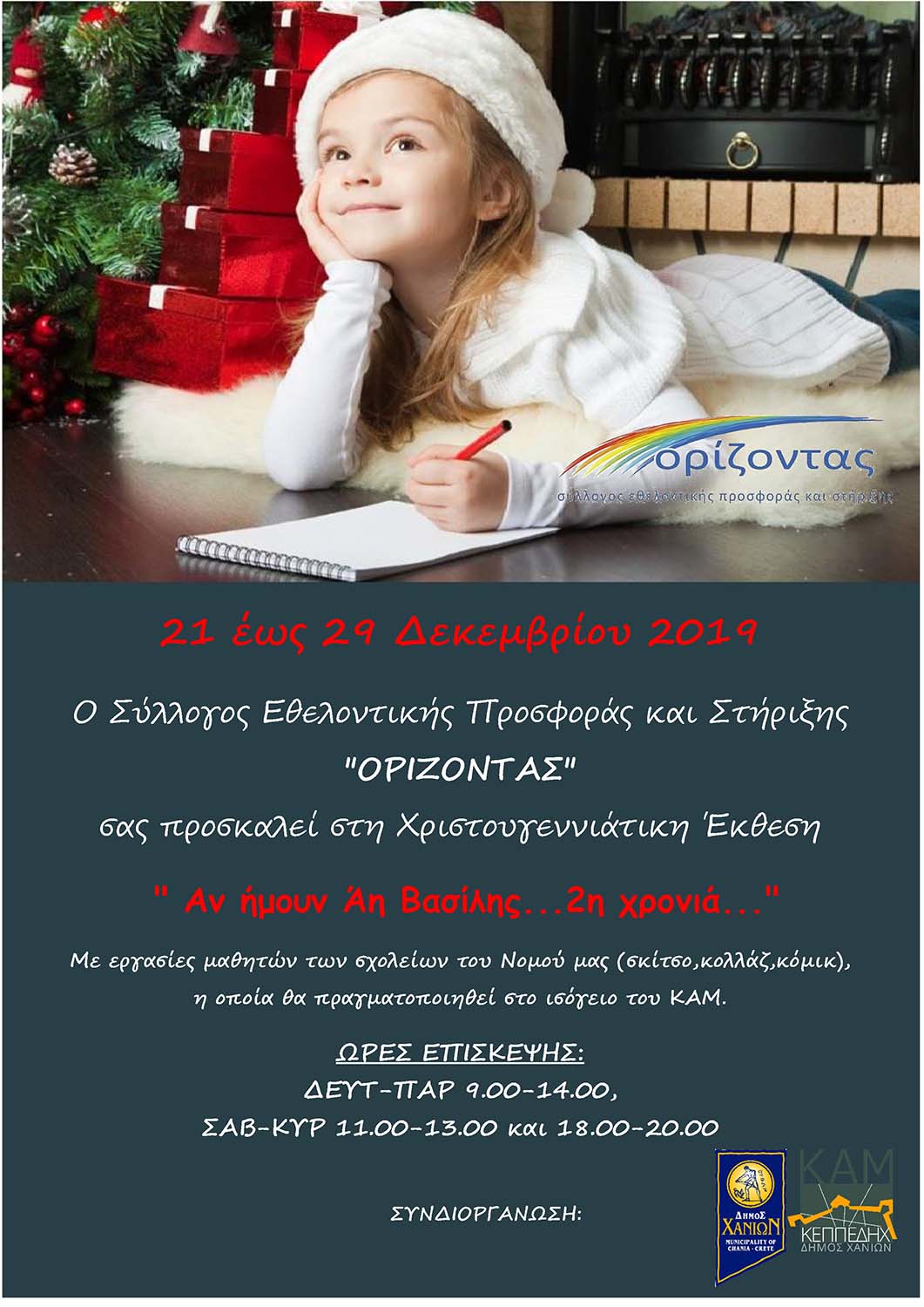 Ο Σύλλογος Εθελοντικής Προσφοράς και Στήριξης ΟΡΙΖΟΝΤΑΣ ανοίγει για 6η συνεχή χρονιά τις πόρτες της χριστουγεννιάτικης εορταγοράς του στα Κουνουπιδιανά Ακρωτηρίου, στην οδό Ελ. Βενιζέλου στην πλατεία του Εμπορικού Κέντρου, τη Δευτέρα 16 Δεκεμβρίου ως και την Τρίτη 31 Δεκεμβρίου με διακοσμητικά, δώρα, παραδοσιακά προϊόντα, γλυκά, κατασκευές κ.α.