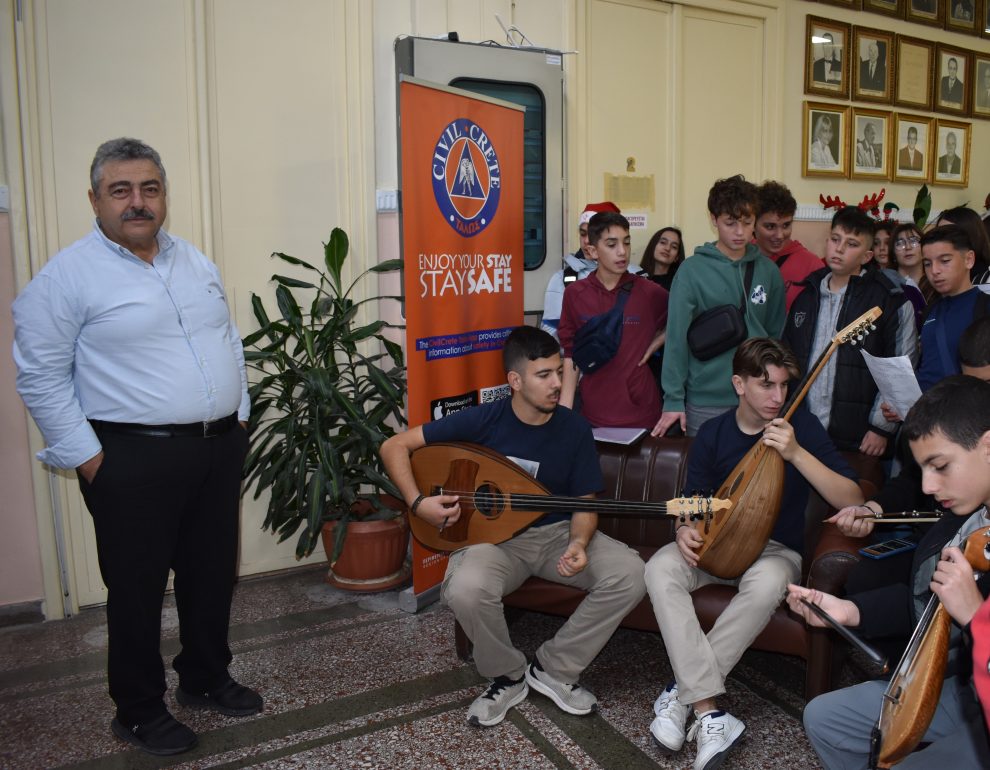 Παρουσία του Αντιπεριφερειάρχη Χανίων Νίκου Καλογερή, και προσωπικού της Π.Ε. Χανίων, 45 παιδιά από το Παραδοσιακό Σύνολο της Β’ Γυμνασίου του Μουσικού Σχολείου Χανίων, συνοδευόμενα από τον Καθηγητή Βυζαντινής Μουσικής κ. Ιωάννη Μαλάκο και από τους Καθηγητές Μουσικής κ. Νικόλαο Χότζα και κα Εμμανουηλία Ντουσάκη, απέδωσαν τα Βυζαντινά Κάλαντα, τα Κάλαντα Φούρνων Ικαρίας και τα Κάλαντα της Κρήτης, σκορπίζοντας χαρά σε όλους τους εργαζόμενους αλλά και τους επισκέπτες.