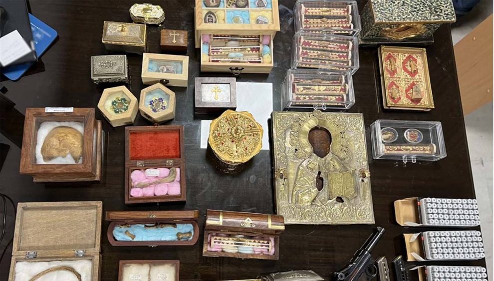 Ειδικότερα, στο πλαίσιο δράσεων για την καταπολέμηση της παράνομης εμπορίας αρχαιοτήτων και την εν γένει προστασία της πολιτιστικής κληρονομιάς που εκπονεί η Γενική Περιφερειακή Αστυνομική Διεύθυνση Κρήτης και κατόπιν κατάλληλης αξιοποίησης πληροφοριών, συνελήφθη στο πλαίσιο αστυνομικής επιχείρησης ο ανωτέρω ημεδαπός, ο οποίος διέθετε έναντι αμοιβής προθήκες περιέχουσες -κατά τα λεγόμενά του- τμήματα οστών αποδιδόμενα σε Αγίους της Ορθόδοξης και Ρωμαιοκαθολικής Εκκλησίας, εικόνες και ιερατικά αντικείμενα.