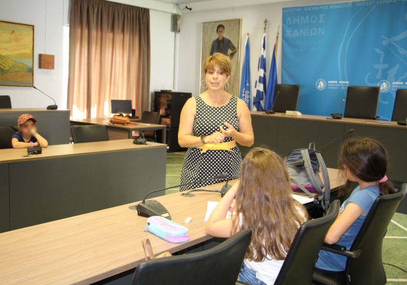 Τους μαθητές υποδέχθηκε ο Δήμαρχος Χανίων, Παναγιώτης Σημανδηράκης, ο Γενικός Γραμματέας του Δήμου, Γιώργος Φραγκιαδάκης,και οι Αντιδήμαρχοι Κοινωνικών Υπηρεσιών και Αθλητισμού, Ελένη Ζερβουδάκη και Στέλιος Μιχαηλάκης, αντίστοιχα. Οι εκπρόσωποι της δημοτικής αρχής ενημέρωσαν τα παιδιά για τη λειτουργία των οργάνων του Δήμου, ενώ απάντησαν και στις απορίες τους.