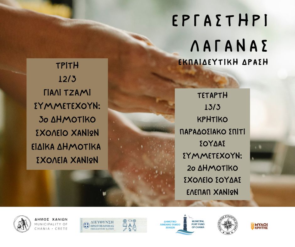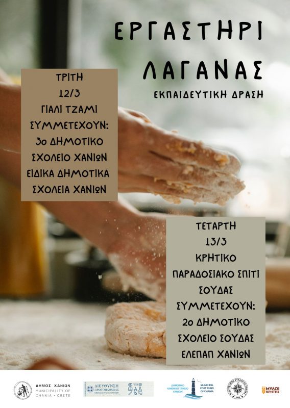 Το Τμήμα Παιδείας & Δια βίου Μάθησης του Δήμου Χανίων και η Διεύθυνση Πρωτοβάθμιας Εκπαίδευσης Ν. Χανίων, σε συνεργασία με το Δημοτικό Λιμενικό Ταμείο Χανίων και τον Πολιτιστικό Σύλλογο Σούδας, διοργανώνουν εργαστήρια λαγάνας, με αφορμή την Καθαρά Δευτέρα και τη Σαρακοστή.