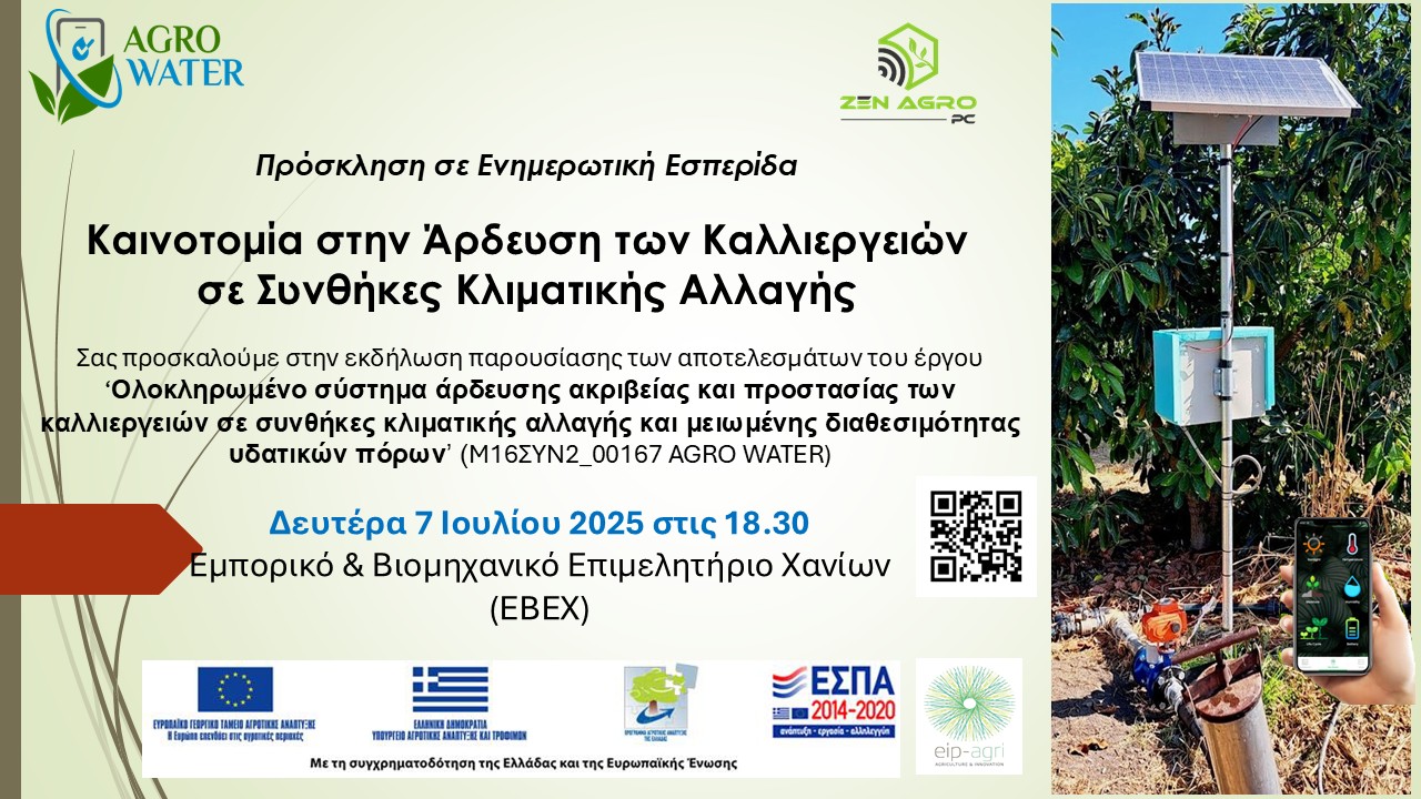 Η ZEN AGRO-Γεωργία Ακριβείας και οι εταίροι του έργου AGROWATER οργανώνουν ενημερωτική εσπερίδα-συζήτηση με θέμα ‘Καινοτομία στην Άρδευση των Καλλιεργειών σε Συνθήκες Κλιματικής Αλλαγής’ τη Δευτέρα 7 Ιουλίου 2025 στις 18.30 στην αίθουσα του Εμπορικού και Βιομηχανικού Επιμελητηρίου Χανίων (ΕΒΕΧ). Θα παρουσιασθούν τα αποτελέσματα του έργου ‘Ολοκληρωμένο σύστημα άρδευσης ακριβείας και προστασίας των καλλιεργειών σε συνθήκες κλιματικής αλλαγής και μειωμένης διαθεσιμότητας υδατικών πόρων’ (Μ16ΣΥΝ2_00167 AGROWATER, Πρόγραμμα Αγροτικής Ανάπτυξης ΠΑΑ-ΕΣΠΑ 2014-2020.