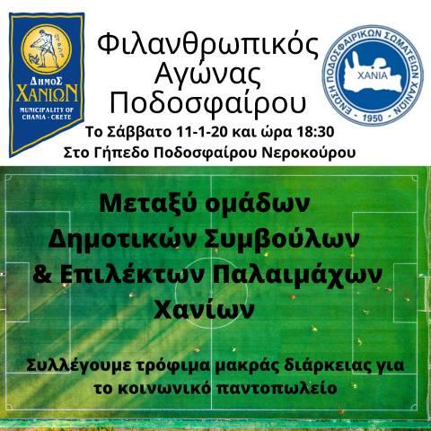 Αντιμέτωποι θα βρεθούν στο γήπεδο, η ομάδα Δημοτικού Συμβουλίου Χανίων που απαρτίζεται από μέλη όλων των παρατάξεων του δημοτικού συμβουλίου και η μεικτή ομάδα παλαίμαχων Χανίων. Ο αγώνας θα γίνει σήμερα Σάββατο 11 Ιανουαρίου, στις 18.30, στο Δημοτικό Γήπεδο Νεροκούρου.