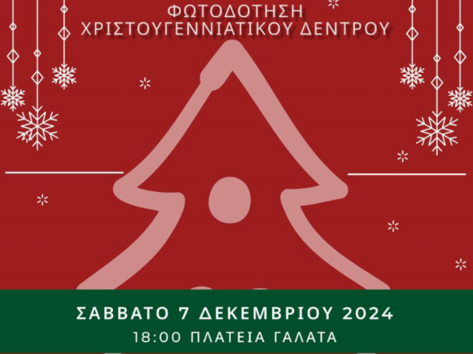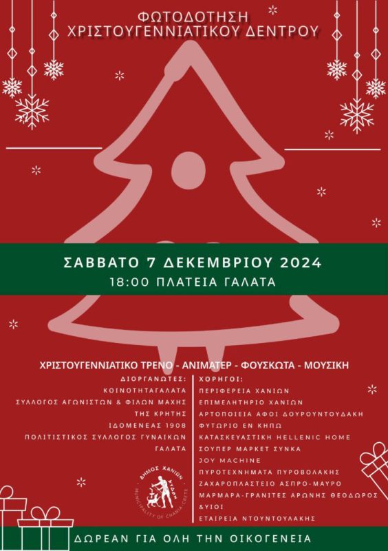 O Δήμος Χανίων, η Κοινότητα Γαλατά, ο Σύλλογος Αγωνιστών & Φίλων Μάχης της Κρήτης, ο Αθλητικός Σκοπευτικός Σύλλογος «ΙΔΟΜΕΝΕΑΣ» και ο Πολιτιστικός Σύλλογος Γυναικών Γαλατα ανάβει το δένδρο της πλατείας στις 7/12/2024 ημέρα Σάββατο και ώρα 18.00 το απόγευμα. Το Χριστουγεννιάτικο τρενάκι θα περιμένει μικρούς και μεγάλους στην πλατεία από τις 18.00, animater θα βάψουν τα παιδιά με εορταστικά σχέδια και φουσκωτά κάστρα και μουσική (d.j.) θα δώσουν στην πλατεία το εορταστικό κλιμα των εορτών.