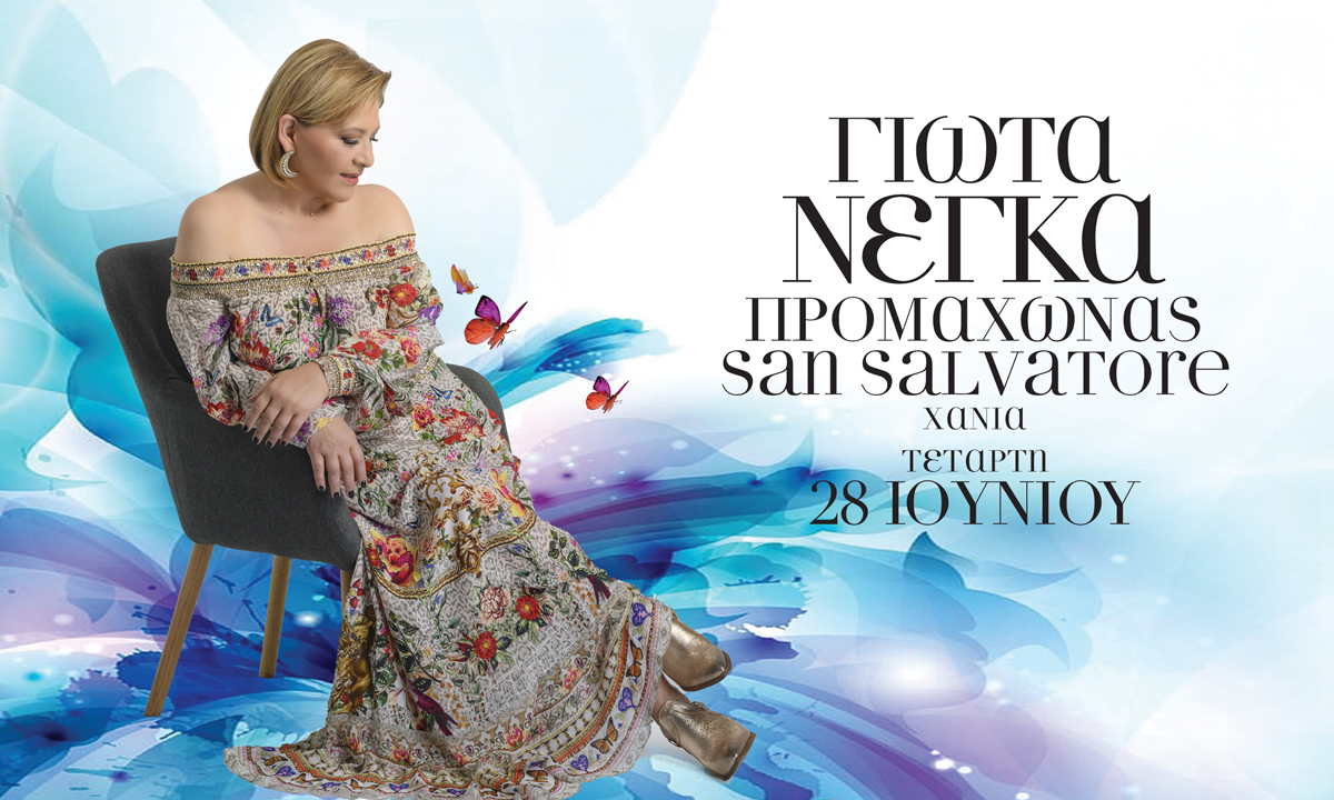 Η Γιώτα Νέγκα, η μεγαλύτερη σύγχρονη λαϊκή ερμηνεύτρια, έρχεται στα Χανιά την Τετάρτη 28 Ιουνίου στον Προμαχώνα San Salvatore σε μια παράσταση-κατάθεση ψυχής, μέσα από τραγούδια τόσο της προσωπικής της δισκογραφίας (Καλαντζόπουλος, Καραμουρατίδης, Μωραΐτης κ.ά.) όσο και κορυφαίων ερμηνευτών και δημιουργών.