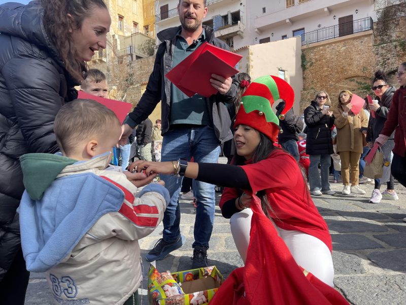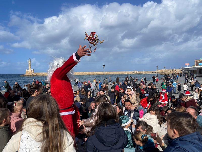 Οι φωνές των παιδιών που συγκεντρώθηκαν στο Ενετικό Λιμάνι Χανίων, καθοδήγησαν και τελικά οδήγησαν με ασφάλεια τον Αϊ – Βασίλη στο Χριστουγεννιάτικο δέντρο της πόλης μας, στην πλατεία Γιαλί Τζαμί.