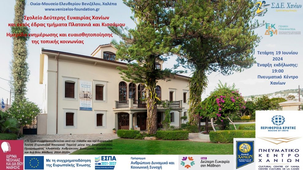 Ημερίδα Ενημέρωσης και Ευαισθητοποίησης της Τοπικής Κοινωνίας διοργανώνει το Σχολείο Δεύτερης Ευκαιρίας Χανίων και τα εκτός έδρας τμήματα Πλατανιά και Κισάμου, την Τετάρτη 19 Ιουνίου 2024, ώρα 19.00, στο Πνευματικό Κέντρο Χανίων.