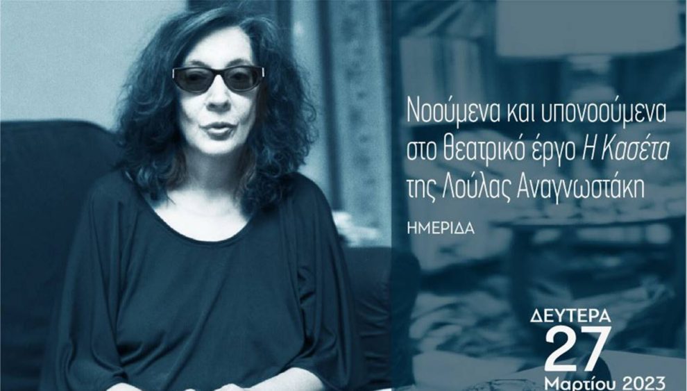 Ο Πανελλήνιος Όμιλος Φίλων του ποιητή Μανόλη Αναγνωστάκη, σε συνεργασία με την Περιφέρεια Κρήτης-Περιφερειακή Ενότητα Χανίων και την Εταιρεία Θεάτρου “Μμήμη”, διοργανώνει τη Δευτέρα 27 Μαρτίου 2023, και ώρα 8.00 μ.μ., στο Θέατρο “Κυδωνία”, ημερίδα με θέμα «Νοούμενα και υπονοούμενα στο θεατρικό έργο “Η Κασέτα” της Λούλας Αναγνωστάκη».