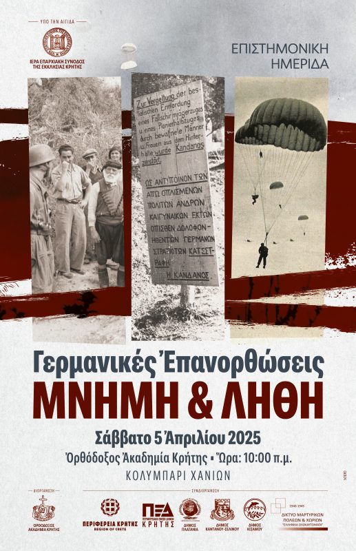 Η Ορθόδοξος Ακαδημία Κρήτης, σε συνεργασία με την Περιφέρεια Κρήτης, την Περιφερειακή Ένωση Δήμων, καθώς και τους Δήμους Πλατανιά, Καντάνου-Σελίνου και Κισάμου, διοργανώνει Ημερίδα με θέμα «Γερμανικές Επανορθώσεις: Μνήμη και Λήθη». Η Εκδήλωση θα λάβει χώρα το Σάββατο, 5 Απριλίου, στις 10:00, στις εγκαταστάσεις του Ιδρύματος, και τελεί υπό την αιγίδα της Ιεράς Επαρχιακής Συνόδου της Εκκλησίας της Κρήτης.