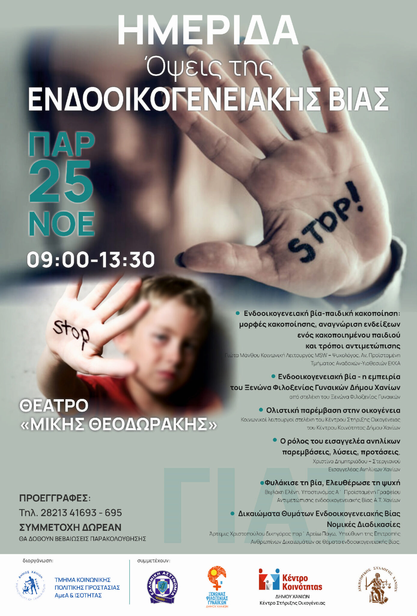 Η ημερίδα υλοποιείται σε συνεργασία με το Γραφείο Ανηλίκων της Υποδιεύθυνσης Ασφαλείας Χανίων, το Γραφείο Ενδοοικογενειακής Βίας της Αστυνομικής Διεύθυνσης Χανίων, τον Δικηγορικό Σύλλογο Χανίων, τον Ξενώνα Φιλοξενίας Γυναικών Δήμου Χανίων και το Κέντρο Στήριξης Οικογένειας του Κέντρου Κοινότητας Δήμου Χανίων, με επίκεντρο τη βία στην οικογένεια.